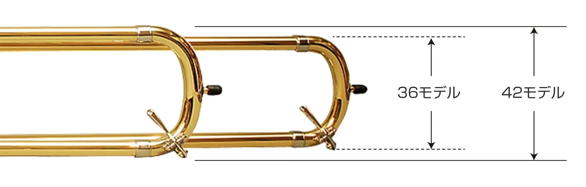 42のモデルは、太管でボアサイズが13.90mmになります。36のモデルは、中細管でボアサイズが13.34mmで少し細いモデルになり、マウスピースは細管用を使用します。また、スライドの幅も若干狭く、手の小さい方にもスライディングがスムーズで、扱いやすくなっています。
