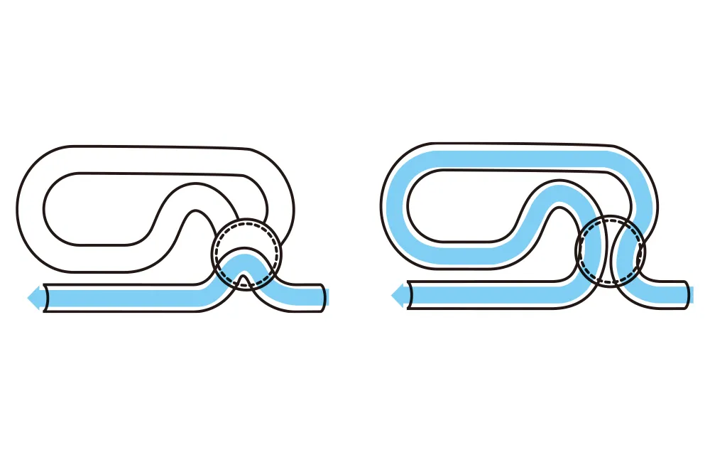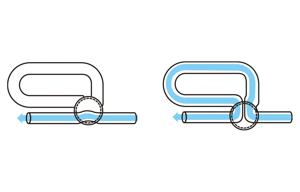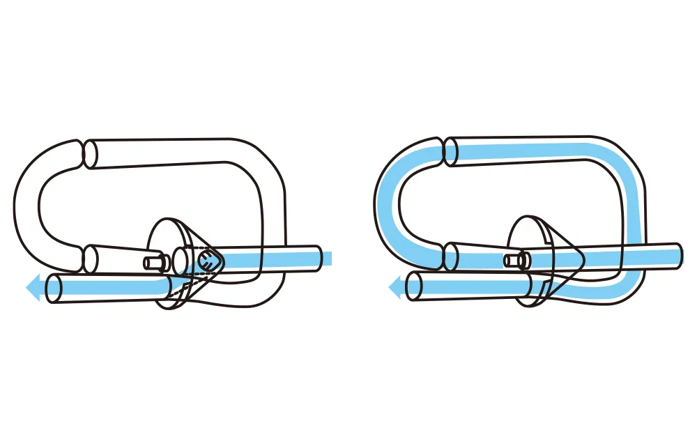ナチュラルホルンのボーゲンの切り替えにヒントを得て発想したもので、可能な限り管の通り道を緩やかに曲げるように工夫した構造を持っています。円錐形の軸を楽器の主管に沿って回転させることで、電車のポイントのように管の通り道を切り替えます。結果として、テナーに近い吹奏感が得られるので、抵抗感が少ないワイドなサウンドを得ることができます。