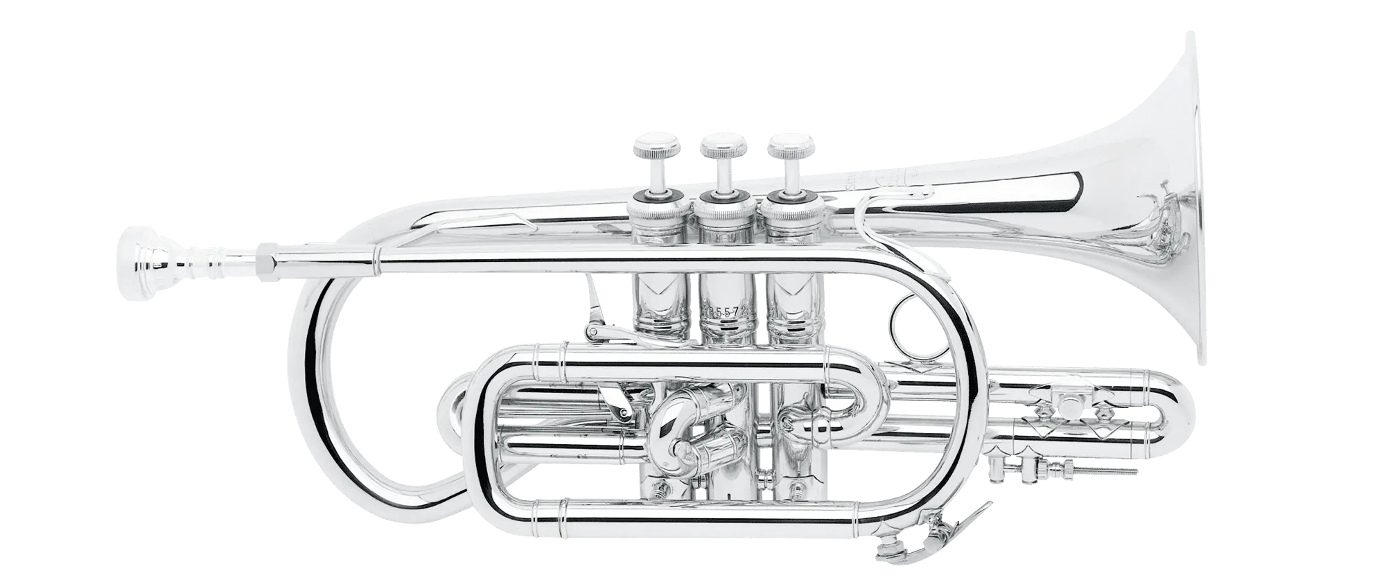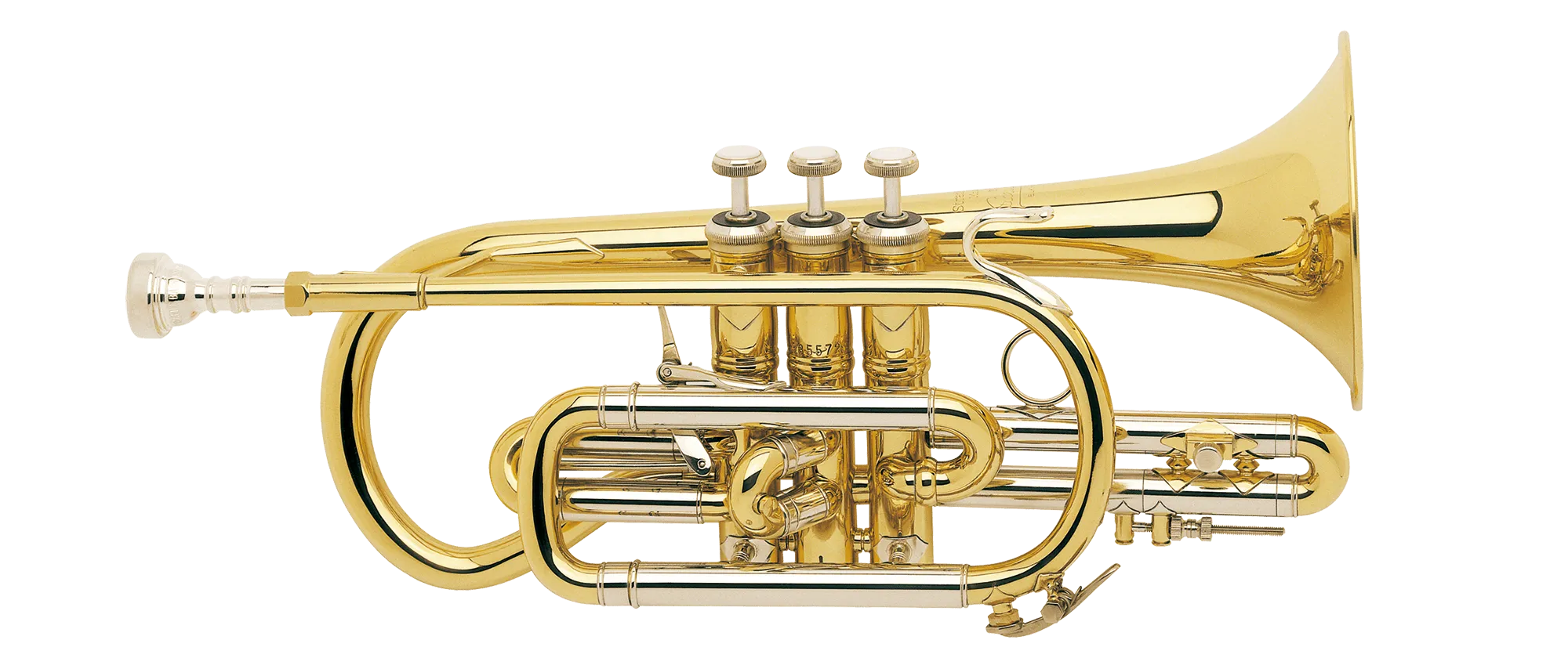 管の巻きが2つ多く、円錐の内径による抵抗感と柔軟性を生かして、スラーやトリプルタンギングなど高い技術が要求される演奏にも適しています。勇ましいトランペットに比べてコルネットはなめらかな音色です。ラージボアのコルネットは、いっそう柔らかく豊かな音色で、コンサートバンドやソロアーティストに向いています。