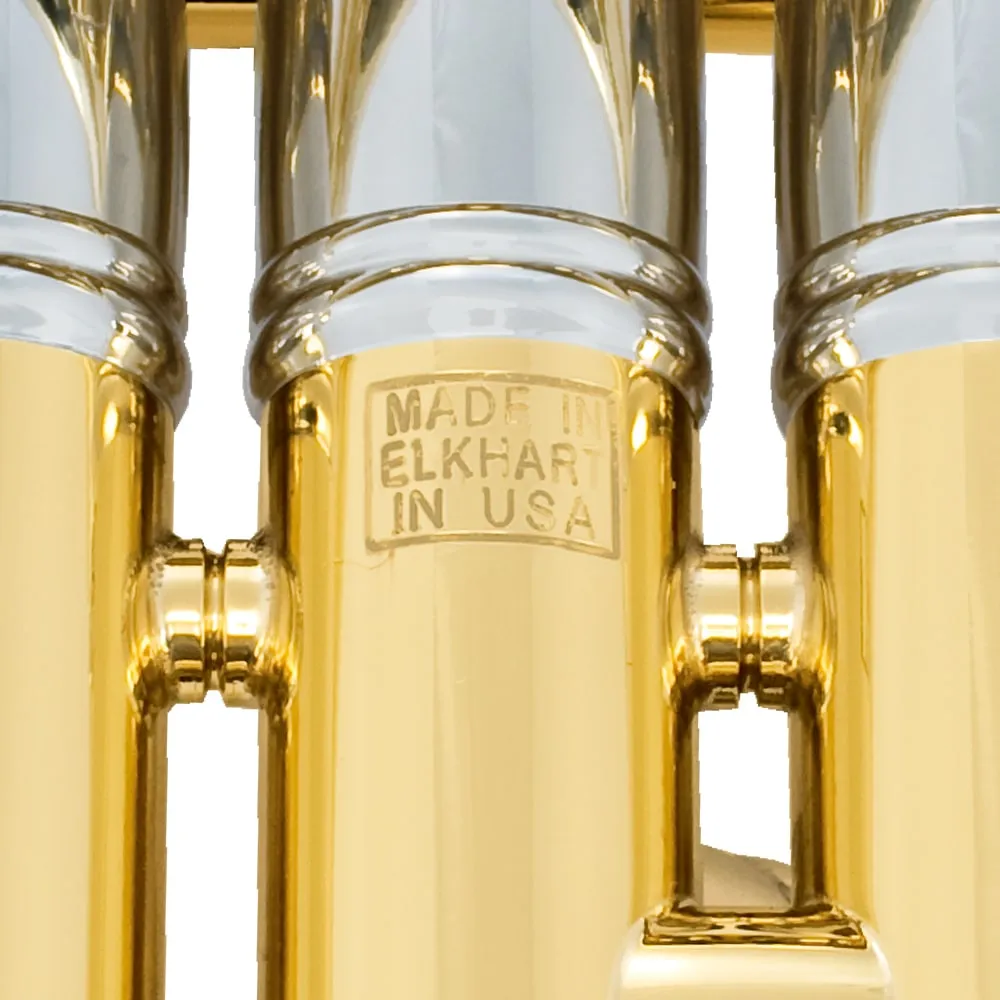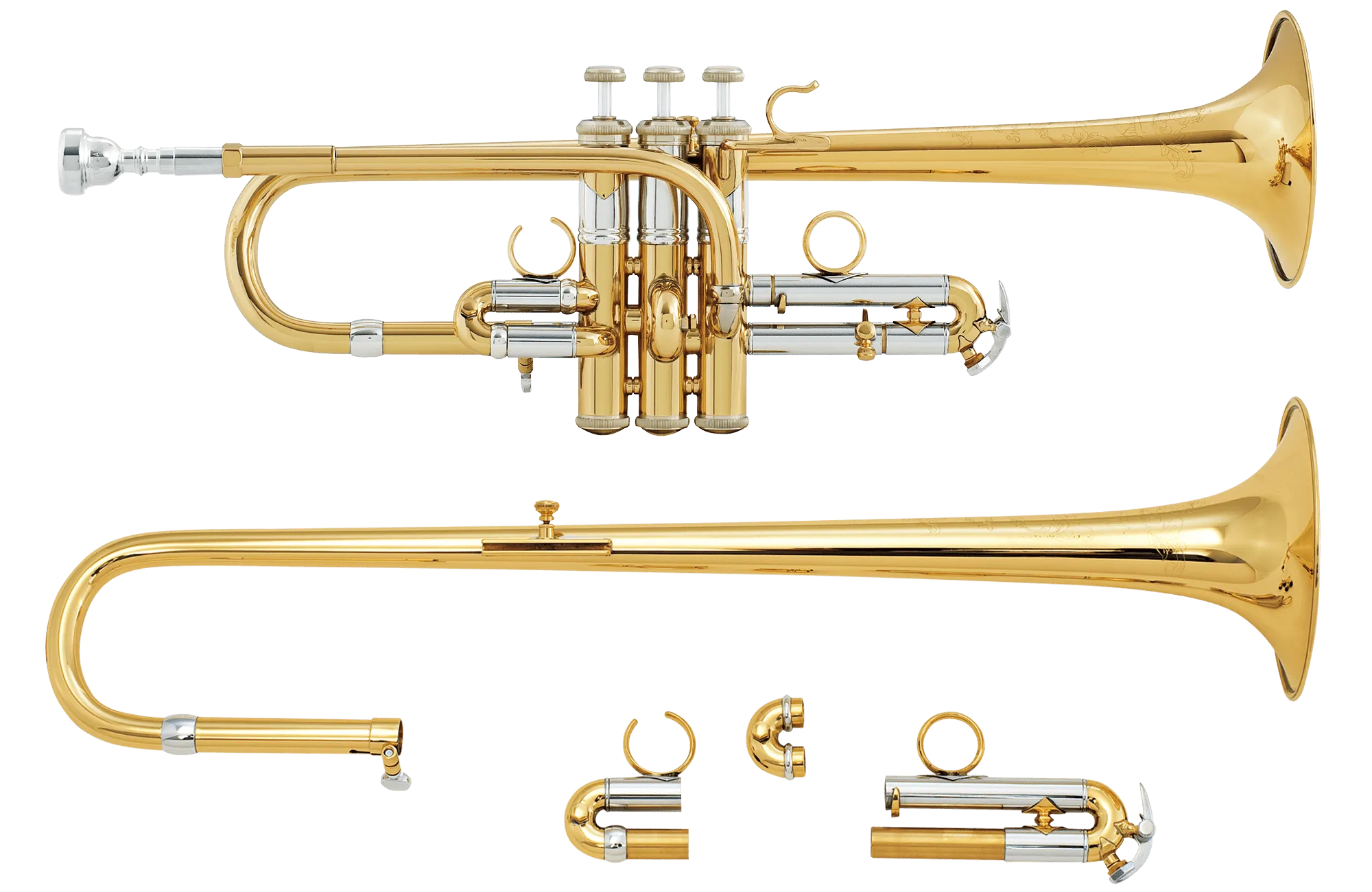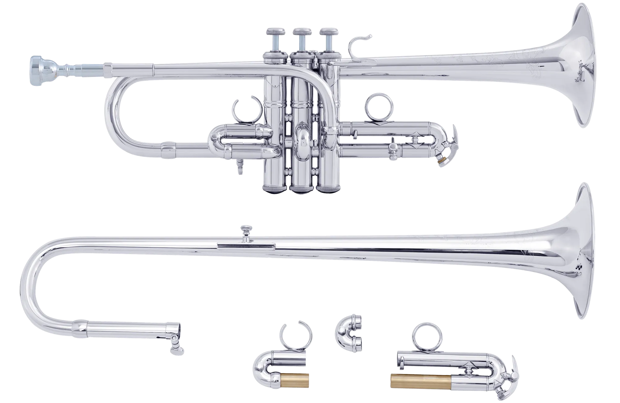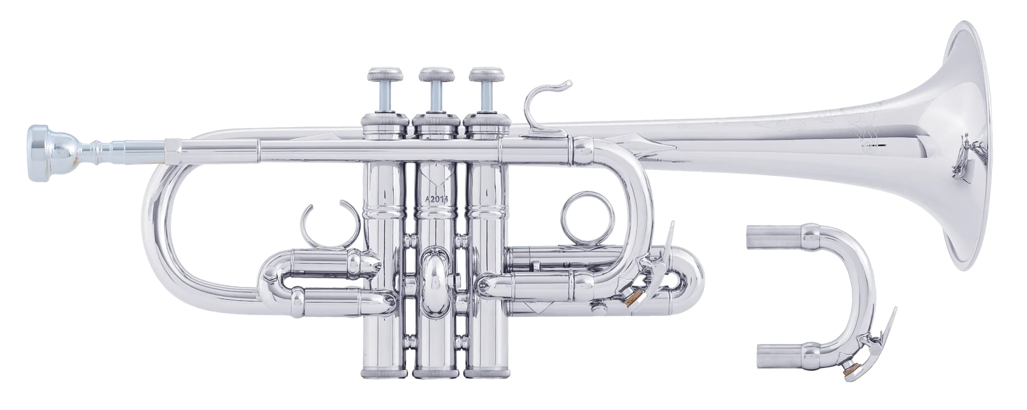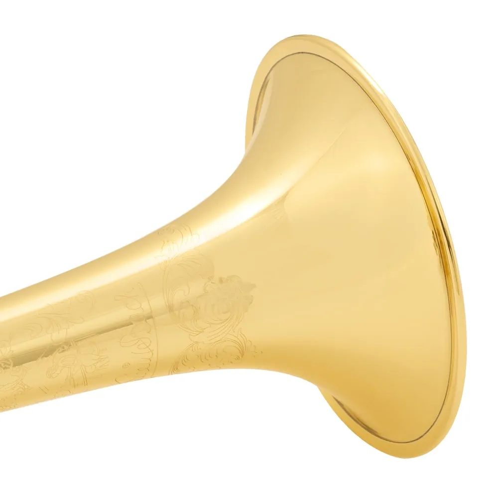 特殊な音響処理が施されたフラットリムのイエローブラス製ハンドハンマード・ワンピースベル、ニッケルシルバー/真鍮2ピース構造のバルブ・ケーシング、モネルメタルピストン、バルブガイドには真鍮製と樹脂製がセットで付属、クラシカルでふくよかなデザインの接合部金環、1stスライドは「スピリット・リング」状の指かけ、専用の製造番号、豪華な彫刻等々、数々の「往事の新しいデザイン」が施されています。