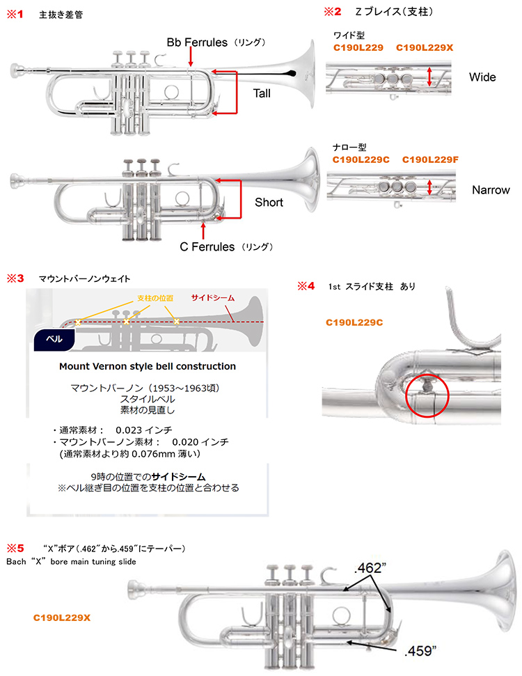 僅かに軽量の「マウントバーノンウェイト」229ベル、電光石火のレスポンス「Bach “X” bore main tuning slide」(.462"から.459"にテーパー<※5>)採用。