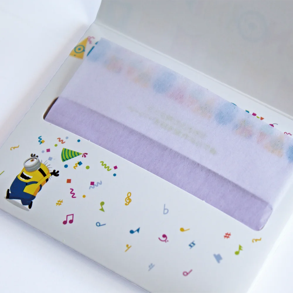 日本三大和紙のひとつ、岐阜県の美濃和紙を使用。タンポやトーンホールの水分や汚れを拭き取ってベタつきを解消します。ミニオン達が集まって、ワクワクドキドキなパーティーの始まり!カラフルな音符をあしらったデザインです。